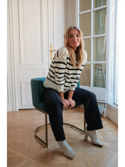 Jersey de punto en color blanco y rayas azul marino. Cuello redondo con borde ondulado y mangas largas con borde ondulado en los puños.